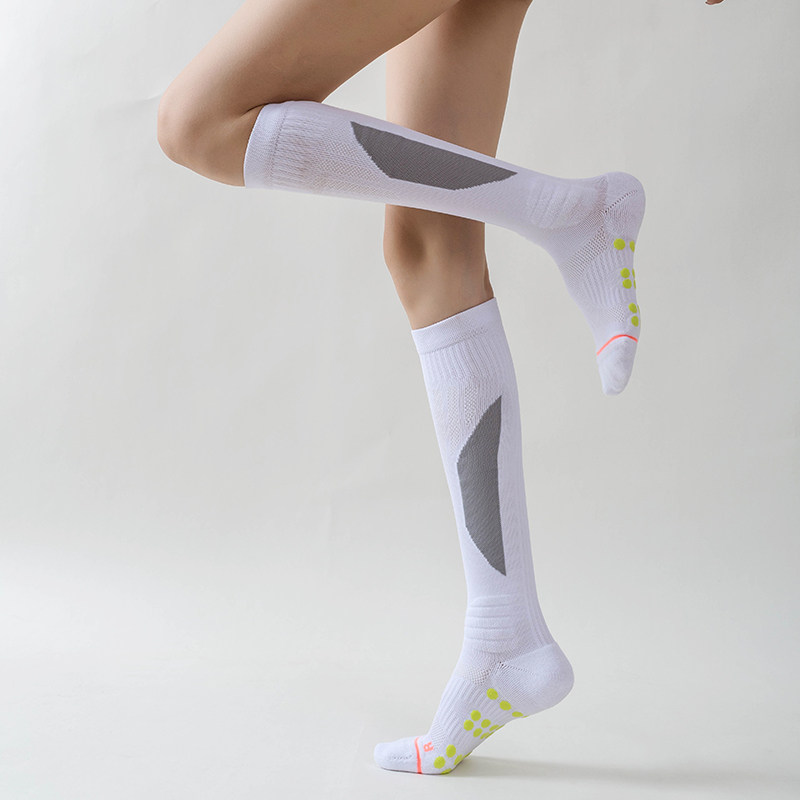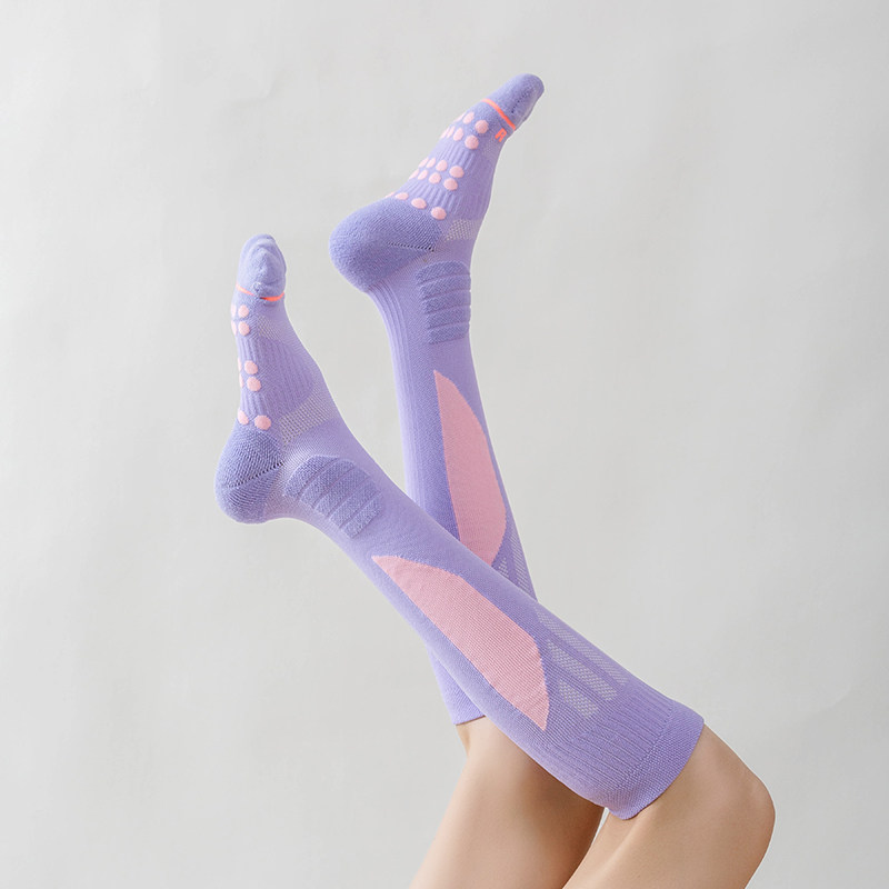 Mid-calf compression socks engineered to improve circulation and reduce fatigue. Non-slip grip ensures secure footing during yoga, pilates, barre, or running. Elastic fibers provide support, while breathable fabric keeps feet dry and comfortable.