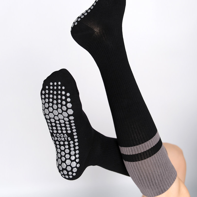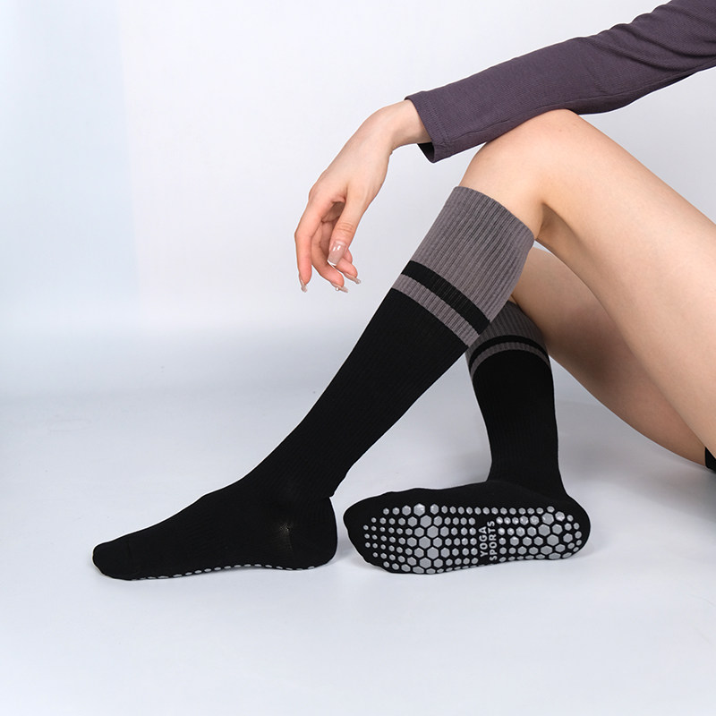 Elastic mid-calf socks for women during indoor fitness sessions. Non-slip soles provide traction on smooth floors. Split-toe design enhances natural toe alignment and balance. Breathable fibers ensure comfort during yoga, pilates, barre, or skipping rope.