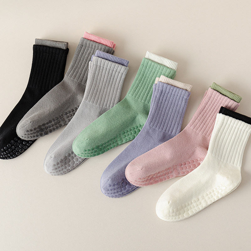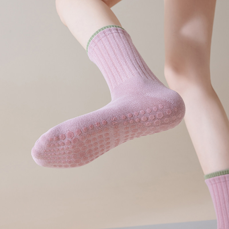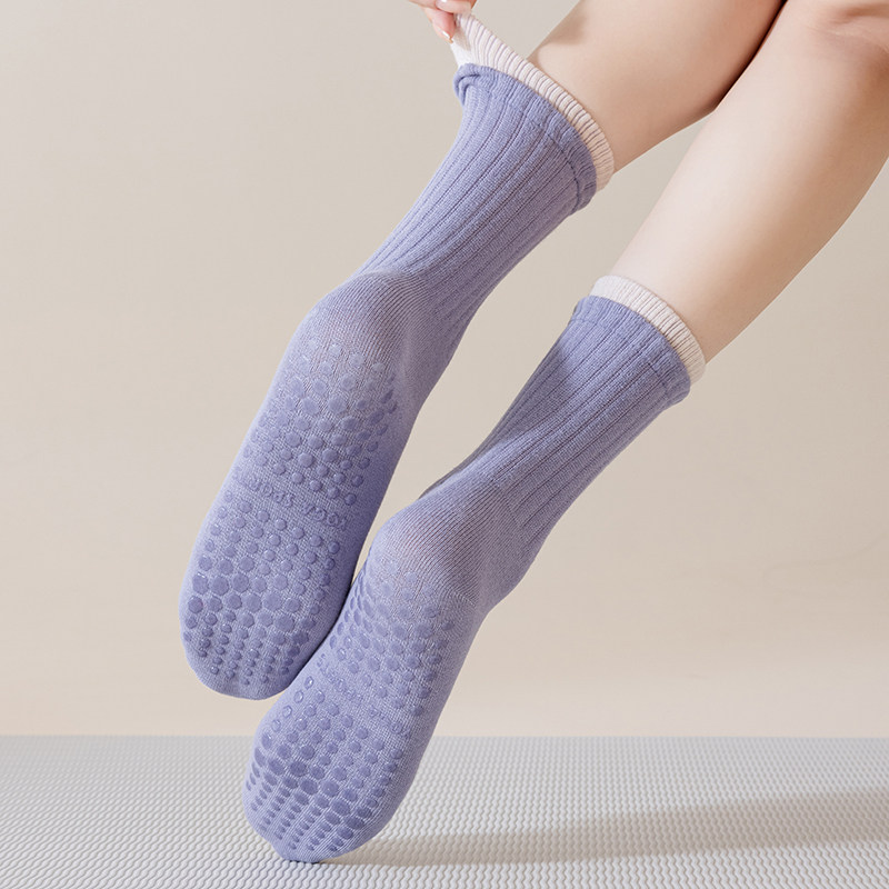 Elastic indoor socks designed for yoga, pilates, barre, or running. Non-slip soles provide stability on polished surfaces. Mid-calf coverage supports the ankle, while breathable, soft fibers ensure comfort for extended practice.